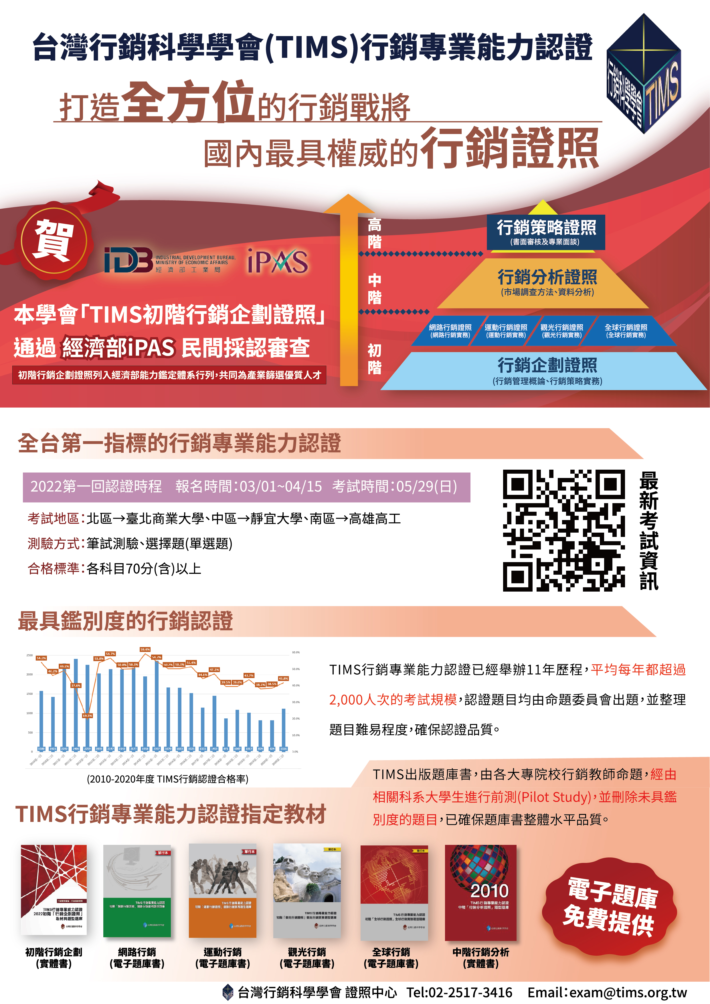 台湾行销科学学会即将于111年05月29日办理全国「 2022年第一回-TIMS行销专业能力认证」, 本次来信特别提供电子海报(附件),希望助教可以公布贵系网站, 鼓励健行科技大学国际企业经营系学生踊跃报名。 以下为本学会认证相关介绍: