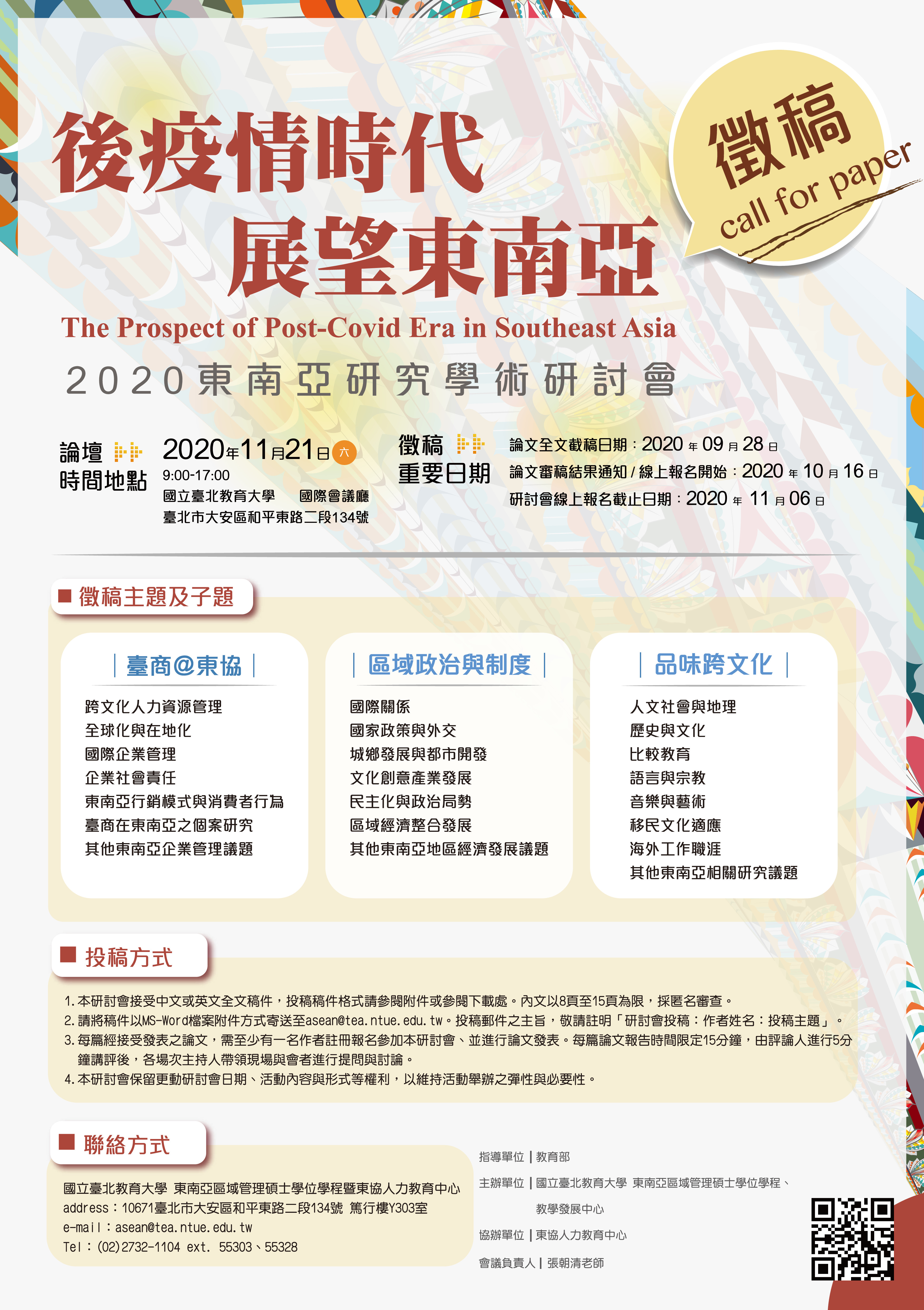 《公告》國立臺北教育大學舉辦「2020東南亞學術研討會:後疫情時代,展望東南亞」鼓勵相關系所師生及研究人員踴躍投稿