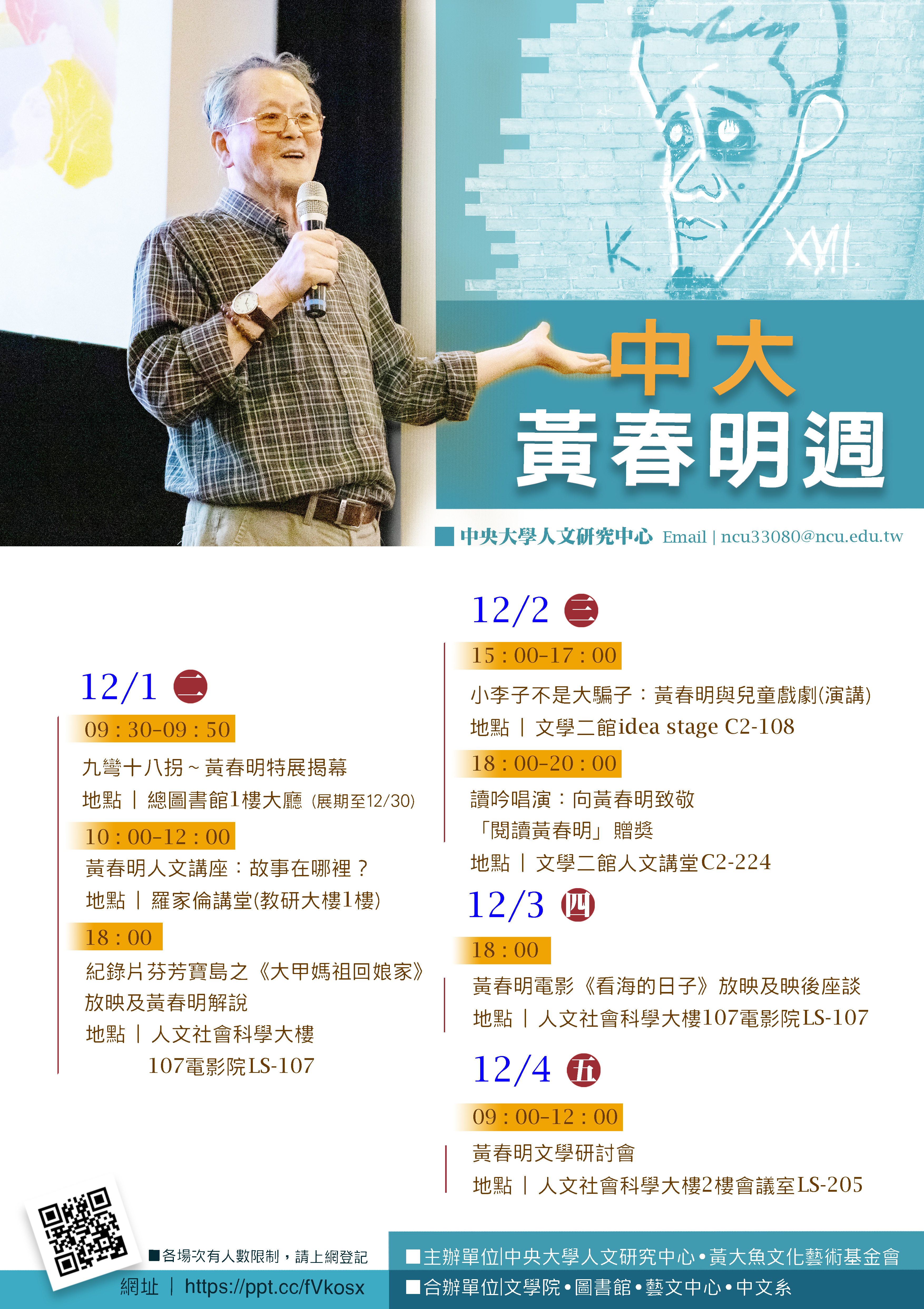 主旨:本校人文研究中心謹訂於109年12月1日至4日舉辦「中大黃春明週」,敬請轉知所屬單位相關系所並鼓勵師生踴躍參與,請查照。