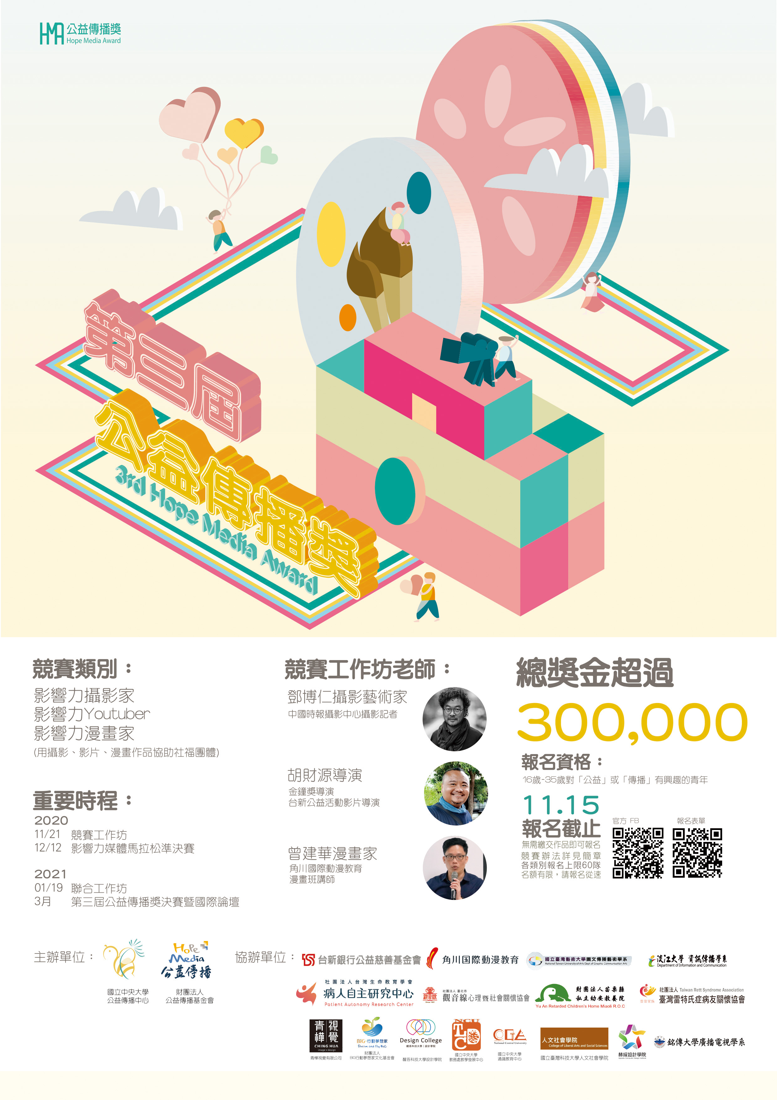 國立中央大學「第三屆公益傳播獎」 2020-10-27 來(發)文機關:國立中央大學 主旨:檢送「第三屆公益傳播獎」簡章、海報與宣傳文稿,總獎金超過30萬元。敬請協助宣傳。 說明:本校公益傳播中心舉辦「第三屆公益傳播獎」,總獎金超過30萬元。敬請協助宣傳給相關系所,至紉公誼。 活動簡章1.pdf 活動簡章2.pdf Tweet 列印本頁